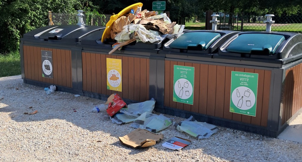 Vaux: Débordement et sacs laissés devant les bacs de tri sélectif et cartons. Odeur infecte du bac de bio déchets avec plein de guêpes autour! Très dangereux si vous êtes allergique aux piqûres de guêpes!