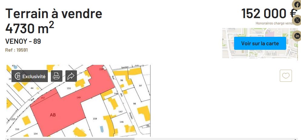 A notre grande surprise, nous retrouvons cette parcelle à vendre sur le site d’une agence immobilière d’Auxerre au prix de 152 000 euros.